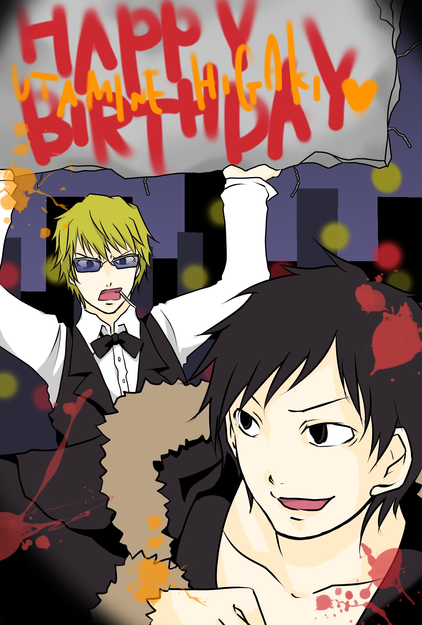 お友達の灯垣宴峰ちゃんのお誕生日を記念して描きました。デュラララ4話くらいまでしか見てないけどがんばった。 こだわったところ:ぐらさん。飛び散ってるのはスプレーのインクなんだからね!勘違いしないでよね!/// *お絵かき帳にもどる* *さいしょにもどる*